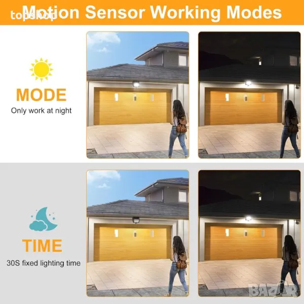 Linke 80W Security Lights" са проектирани да осигурят изключителна яркост и енергийна ефективност. С 98 високоефективни лампови перли, тези светлини осигуряват мощен изход от 7200 LM и студена цветова температура от 6500K, като ефективно заместват 180W традиционна крушка с нажежаема жичка и спестяват над 85% от разходите за електроенергия. Те разполагат с фиксирана продължителност на осветяване от 30 секунди и работят изключително през нощта, като засичат движение на разстояние до 12 метра. Това автоматично активиране опростява работата, елиминирайки необходимостта от ръчно превключване. Оценени като водоустойчиви IP66, прожекторите са напълно защитени от прах и могат да издържат на тежки водни струи, което ги прави подходящи за всякакви метеорологични условия и идеални за външна среда. Инсталирането е лесно благодарение на включените аксесоари за монтажни винтове и здрава, регулируема на 180° метална скоба, която позволява монтиране на таван или стена. Тези характеристики правят светлините идеални за външни зони като паркинги и пътеки, подобрявайки сигурността и видимостта.