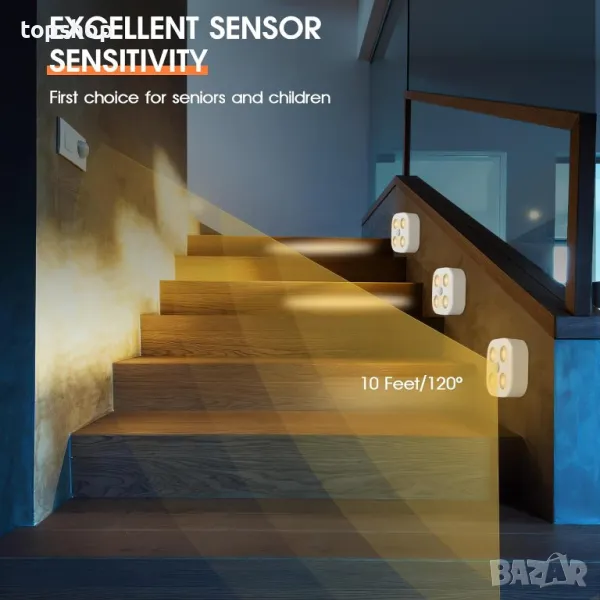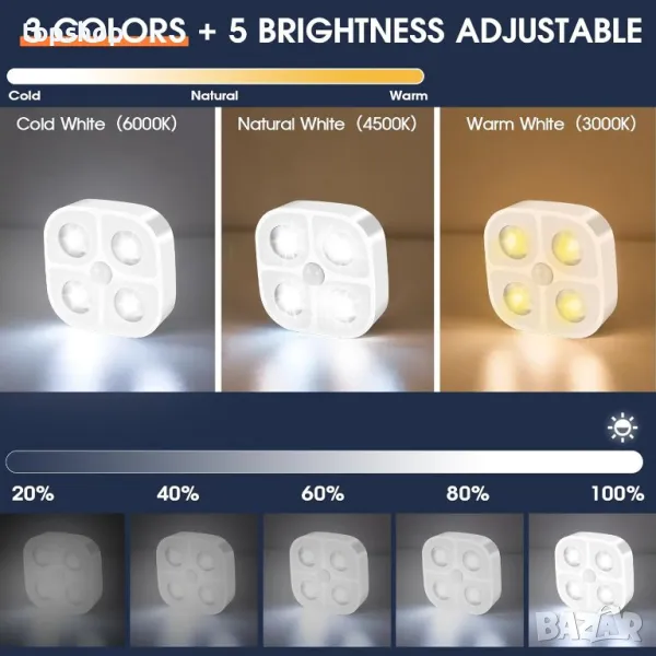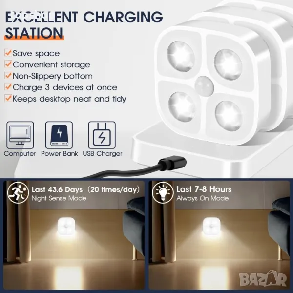 Представяме ви подобрената нощна лампа Bright & Smart — осветително решение с 4 LED крушки с висока яркост, разширяващи осветената зона и осигуряващи дълготрайна яркост. С нощен режим за откриване на движение в обхват от 5 метра, тя автоматично светва при движение и се изключва след 30 секунди бездействие. Изберете от три цветови температури (6000K, 3000K, 4500K) с дистанционно управление за лесни настройки. Монтажът е лек с вграден магнит или супер силно лепило. Ефективното зареждане е гарантирано с докинг станция, която зарежда три лампи едновременно, захранвана от презареждаема литиево-йонна батерия за екологична и дълготрайна употреба. Идеален за родители и възрастни хора, предотвратявайки рисковете от спъване по време на нощни разходки.
