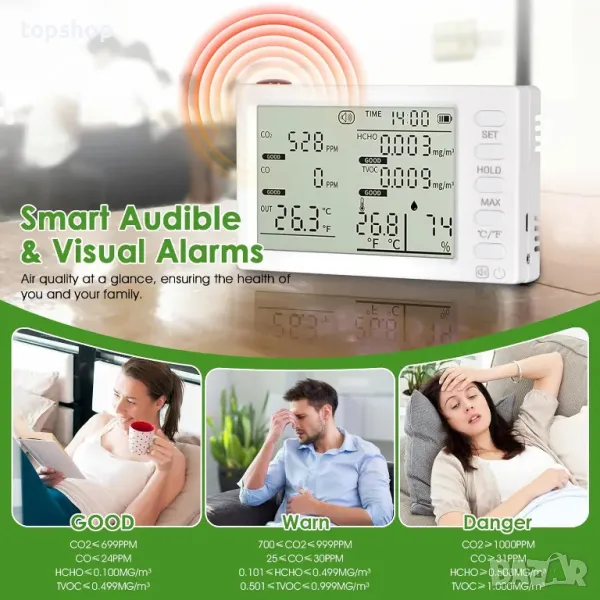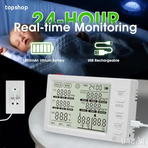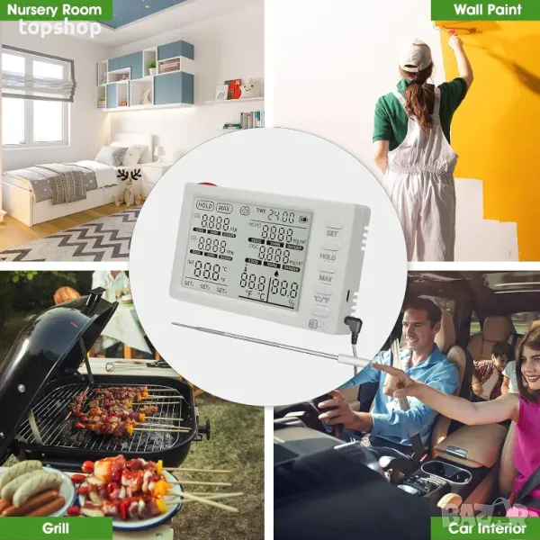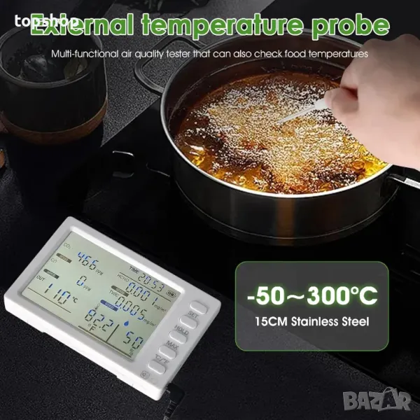Този монитор за качество на въздуха 8 в 1 осигурява проследяване в реално време на TVOC, HCHO, CO, CO2, температура, влажност и време, с функции за калибриране на данни и максимална стойност за точни показания. Неговата външна 198 mm сонда от неръждаема стомана измерва температури от -50°C до 300°C, което го прави полезен за готвене. Предупреждение с червена светлина сигнализира, когато качеството на въздуха надхвърли зададените граници, осигурявайки по-здравословна среда. Вградената акумулаторна батерия от 1200mAh предлага до 10 часа работа, а олекотената й конструкция позволява монтиране на стена или поставяне на маса. Подходящ за домове, офиси, кухни, училища и др.
