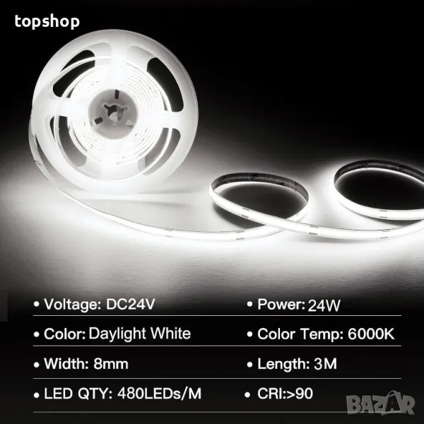 SIRYYUI COB LED лента 3M,6000K, 480LEDs/M, DC24V, CRI 90+ с RF дистанционно и захранване