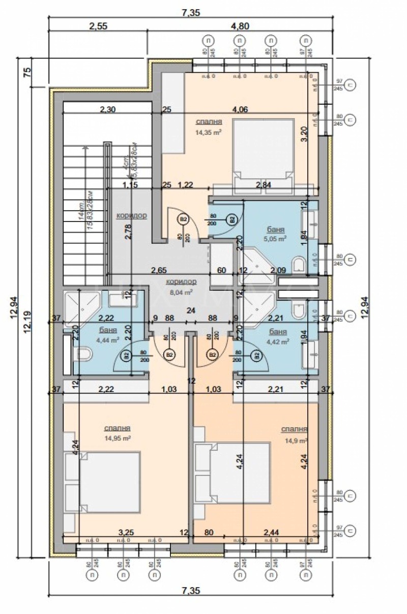 втори етаж: три спални със самостоятелна баня с тоалет.