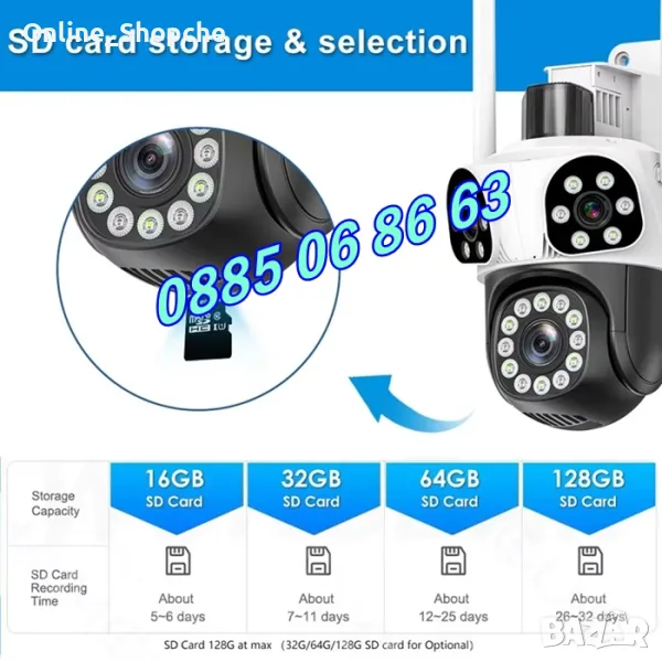 - Памет и съхранение: Слот за TF карта до 128 GB с криптиране и възможност за облачно съхранение. Отдалечен преглед чрез приложението iCSee, XMeye, XMEye Pro на смартфон.