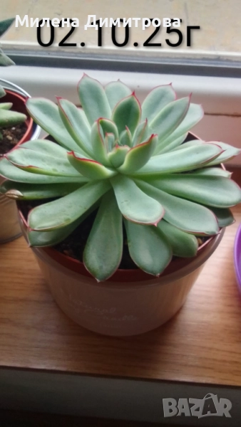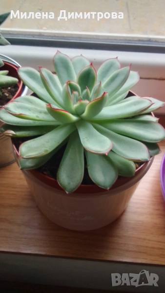* Красив сукулент с бледо зелени листа с червени ръбове по края.
