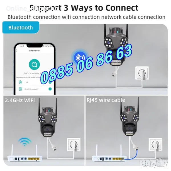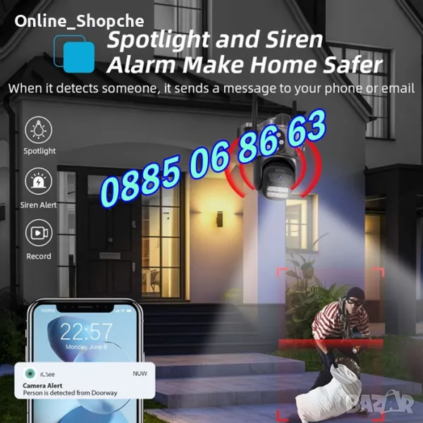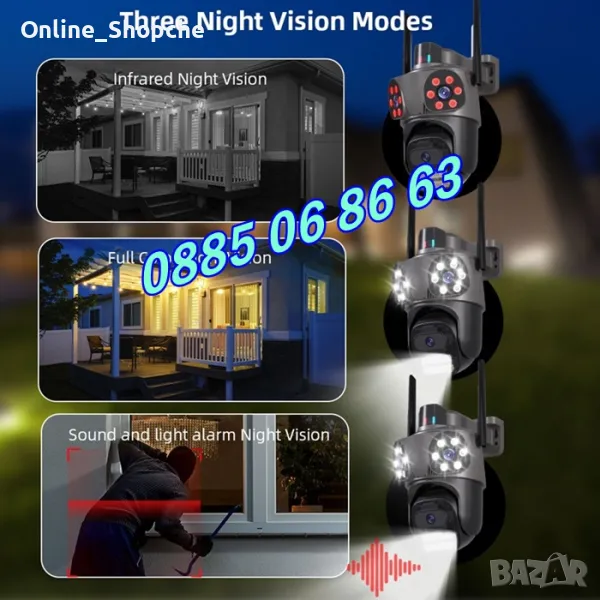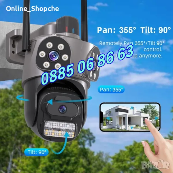 Нов модел иновативна двойна външна WiFi камера с Ultra HD резолюция. Три камери в един корпус: Стационарни и ротационна (въртяща се). 10 Mpx резолюция и за трите обектива. Auto tracking функция за хоризонтално проследяване на движение от ротационната камера. Вграден високочувствителен цифров микрофон за аудио мониторинг и говорител за двупосочна аудио връзка. High Power LED осветители за цветно нощно виждане до 30 метра. Функция за хоризонтално и веетикално проследяване на движението на ротационната камера. Слод за micro SD карта до 128GB. Безплатно мобилно приложение за iPhone и Android - ICSee, XMeye, XMEye Pro за отдалечено наблюдение в реално време и преглед на записите. Завъртане от мобилен телефон по хоризонтала на 270° и по вертикала на 90°. Широкоъгълни обетиви с фокусно разстояние 3.6мм на трите камери, с хоризонтален ъгъл на сцената 90° на стационарните и 120° на въртящата се камера. Функционална стойка даваща възможност за лесен монтаж на таван или стена. Камерата разполага с три нощни режима на работа: Цветен нощен режим, черно-бял нощен режим и цветен нощен режим при движение.