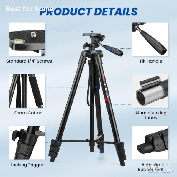 Практичен статив за мобилен телефон: изработен от висококачествена алуминиева сплав и ABS, здравата триъгълна рамка и неплъзгащите се гумени подложки могат да издържат тегло до 3,0 кг. Стативът е подходящ за различни смартфони и малки фотоапарати. Той е идеалният избор за заснемане на вълнуващи снимки или създаване на интересни видеоклипове, за да запечатате живота.