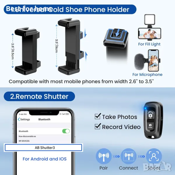 По-добра съвместимост: този статив има глава с универсален 1/4-инчов винт за леки цифрови фотоапарати, DSLR, ринг-осветителни тела, проектори, уебкамери и други. Държач за мобилен телефон със студена обувка, регулируем по ширина между 2,6 - 3,35 инча. Съвместим с iPhone 12 / 13 / 14 / 15 / 15 Pro Max SE / 11 Pro Max / XR / XS / 8 Plus / 8, Samsung Galaxy S20 / S20 + / S20 Ultra / S10 / S10e / S9 / S9 Plus / Note 8 / S8 / S8 Plus / S8 Plus / S. Huawei 7, Huawei