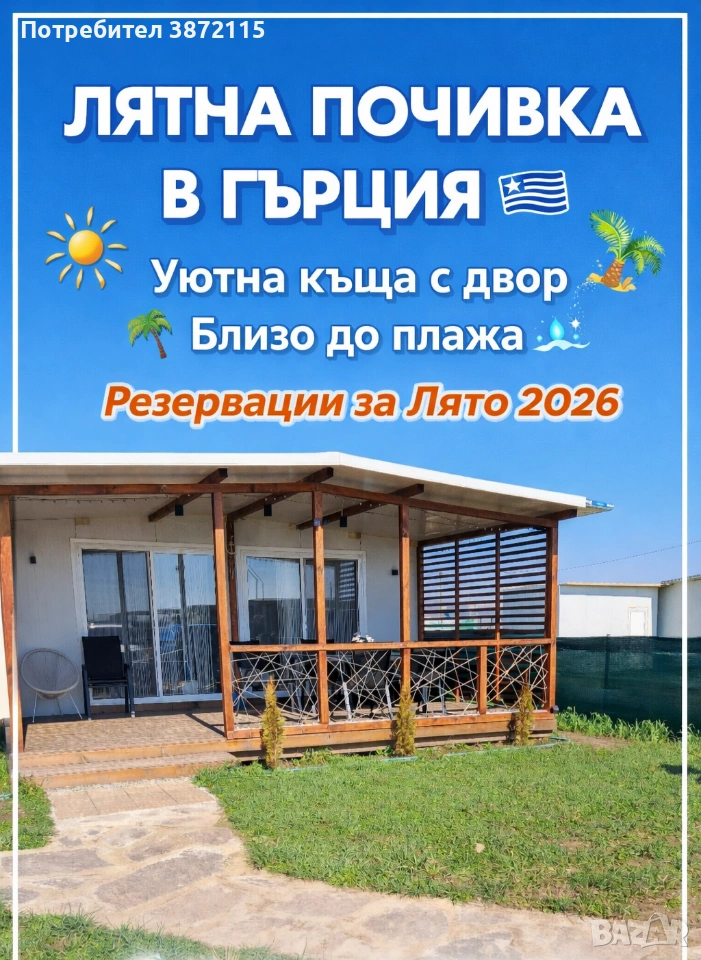 идеална за спокойна лятна почивка със семейство или приятели.🏡 разположена само на 400 м от плажа. 🔹 Капацитет: до 7 човека Къщата разполага с: 🛏️ Две самостоятелни стаи, като всяка стая разполага с: спалня единично легло собствен санитарен възел ❄️ климатик 🍽️ напълно оборудван кухненски бокс, включващ: кафемашина съдомиялна машина микровълнова фурна 🌿 Просторна покрита веранда 🔥 Барбекю зона 🎠 Детски кът с люлки и батут 📺 Телевизия 🌐 Wi-Fi интернет 🚗 Място за паркиране 📍 В близост има магазини и таверни 👨‍👩‍👧‍👦 Подходяща за семейства с деца 🧘 Тиха и спокойна локация – идеална за почивка