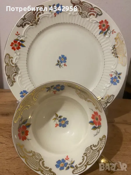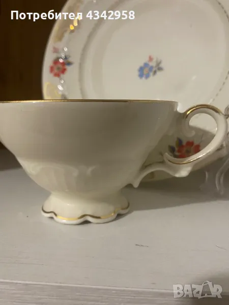 Много красив старинен порцеланов комплект.Чиния диаметър -19 см, чаша - 10 см.