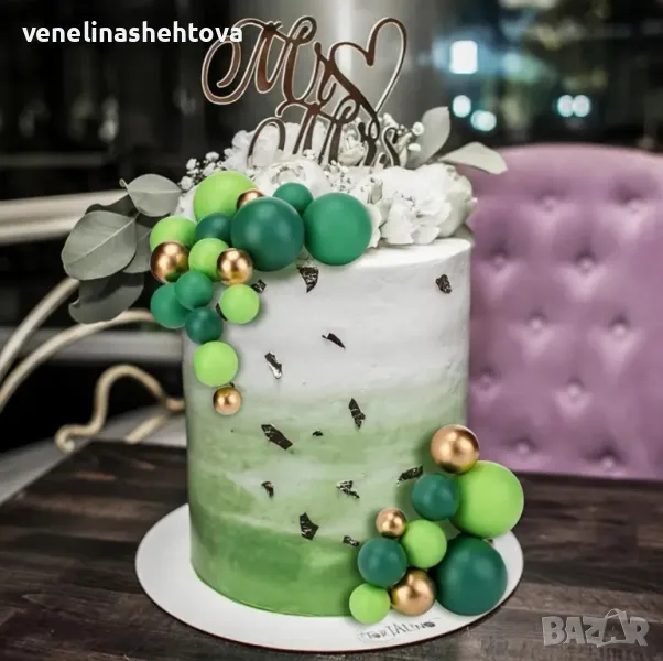 108 броя топчета топки на тел от стиропор за декорация на торта зелени златисти → Обява 50307509