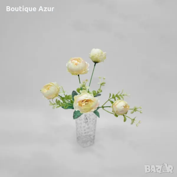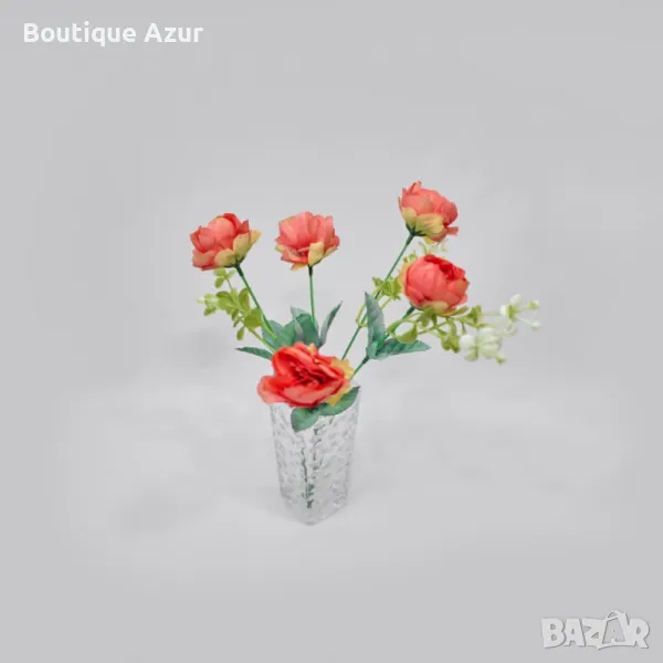 Материал: висококачествена коприна и синтетика;Дължина на стръковете: приблизително 30–35 см;Цветови варианти: Розов, Бледо-розов, Тъмно червен, Бледо-син, Кремав, Червено с жълто;Устойчивост: устойчиви на избледняване, прах и деформация;Поддръжка: препоръчва се леко почистване с влажна кърпа или суха четка;Вазата не е включена в комплекта.