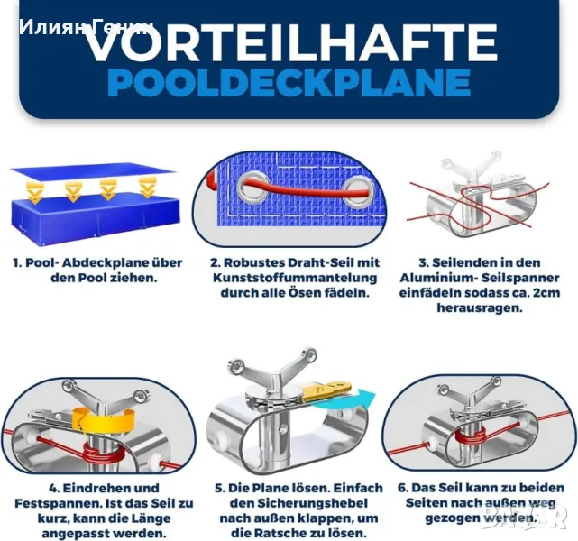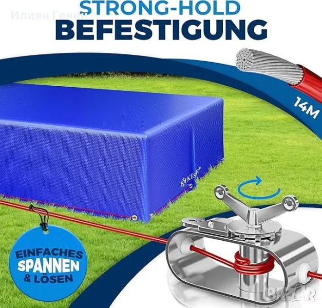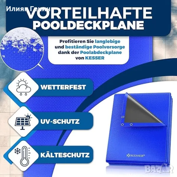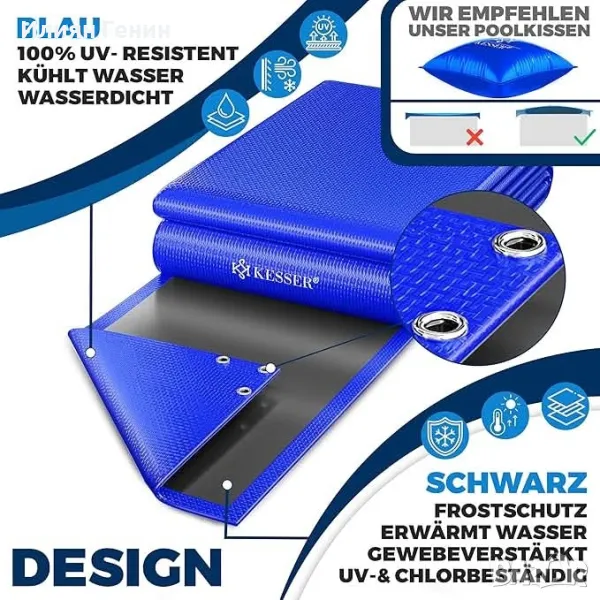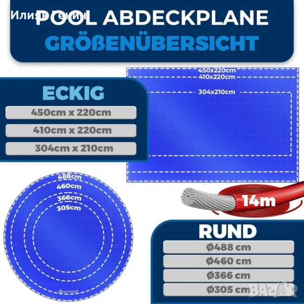 Брезент за басейн, изработен от 200g/m² PE материал, включително стоманен кабел + обтегач на кабела с капсиНашето покривало за басейн от KESSER е незаменим аксесоар за всеки собственик на басейн. Предпазва водата от замърсители, атмосферни влияния и намалява водното изпарение с до 90%, което означава, че трябва да допълвате по-малко вода. Дъждобранът се предлага в различни размери, за да отговори на нуждите на басейни с всякакви размери.ИЗДРЪЖЛИВ: Покривалото за басейн е изработено от висококачествен материал, 200g/m² полиетилен, който е много дебел и издръжлив. Той е 100% водоустойчив и поддържа басейна в отлично състояние през цялата година. Покривалото за басейн е устойчиво на ултравиолетови лъчи и мухъл и може да издържа на температури от -40°C до +70°C. Освен това предпазва от растеж на водорасли, мръсотия, атмосферни влияния и други различни замърсители. Краищата на брезента са подсилени с въже, а шевовете са двойно зашити, за да осигурят висока стабилност и устойчивост на разкъсване. Вградените влакна осигуряват допълнителна стабилност и устойчивост на разкъсване, така че брезентът да остане на място при вятър и време. Освен това капакът може да се използва от двете страни, като синята страна поддържа температурата на водата, а черната страна затопля водата.ЛЕСЕН МОНТАЖ: Брезентът просто се издърпва над басейна и здравото стоманено въже с пластмасово покритие се прекарва през всички отвори на брезента. След това краищата на въжето се завинтват в обтегача на въжето. Въжето се усуква и затяга. Ако въжето не може да се захване поради дължината му, то може просто да се скъси. Капакът може да се освободи по всяко време чрез сгъване на заключващия лост навън, за да освободите тресчотката.РАЗНООБРАЗНА УПОТРЕБА: Брезентът може да се използва по много начини, освен като покривало за басейн. Благодарение на различните си размери, може да се използва като покривало за пясъчник, покривало за лодка, за закрепване на товари върху ремаркето или като работна повърхност. Освен това имате възможност да избирате между кръгъл или квадратен брезент - идеален за всяко приложение.Обхват на доставка1x покривало за басейн Premium KESSER1x стоманен кабел1x обтегач на въже Strong-HoldРазмери на продукта 304 х 210 х 0,01 см14278