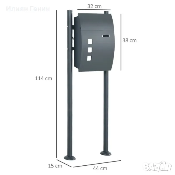 Корпус от поцинкована стомана: Здрав с капак с капак за защита на цилиндъра на ключалката - подходящ като външна пощенска кутия: устойчив на ръжда и леки атмосферни влиянияЗаключваща се пощенска кутия: Пази доставената ви поща в безопасност, само вие имате достъп. Включени два ключаОбмислени детайли: Модерната пощенска кутия разполага с подложки за намаляване на шума върху капака. Освен това има 3 прозореца за преглед, които улесняват проверката на пощата само с един погледПодов и стенен монтаж: Доставя се с винтове и анкери за монтиране на циментов под или допълнителни винтове за окачване близо до вашата входна врата или порта. Само за няколко минути вашата външна пощенска кутия е готова за пощаГабаритни размери: 44L x 15W x 114H cm. Вътрешен размер: 30L x 10W x 37H cm. Размер на слота за поща: 30L x 3,5W cmОписание:✔ Изработен от поцинкована стомана за устойчивост на ръжда и лошо време✔ Голямо вътрешно пространство за съхранение с дълъг слот за лесно съхранение на всички пощенски пратки✔ 3 прозореца за гледане ви поддържат, докато чакате✔ Бравата с капак за предпазване от ръжда, включително два ключа✔ Капакът е с шумопоглъщащи постелки✔ Дизайн за подов монтаж, може и да се окачи✔ Лесен монтаж с включен монтажен хардуерТехнически данни:✔ Цвят: антрацит✔ Материал: стомана✔ Габаритни размери: 44Ш x 15Д x 114В см✔ Вътрешни размери: 30Ш x 10Д x 37В см✔ Размер на вратата: 32Ш x 2,3Д x 38В см✔ Размер на слота за стълб: 30L x 3,5W cmB80-014V00CG