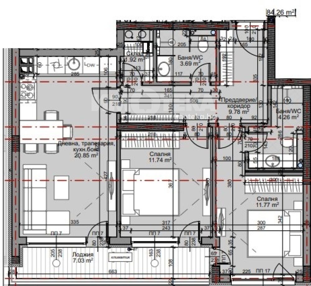 С АКТ 14. Функционален тристаен апартамент. Разположен е на девети етаж. Състои се от: хол с трапезария и кухненски бокс с площ 20.85 кв.м., две спални по 11.74 кв.м. и 11.77 кв.м., две санитарни помещения, балкон и склад. Изложението е югоизточно. Има възможност за покупка на гараж или паркомясто.