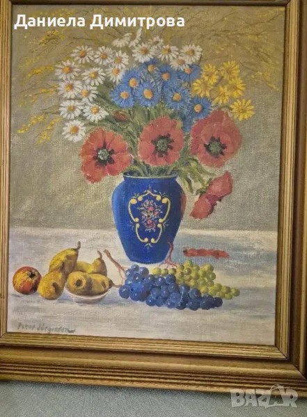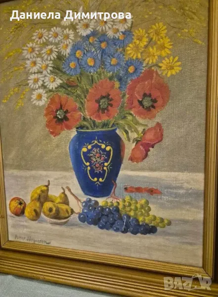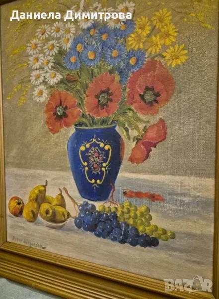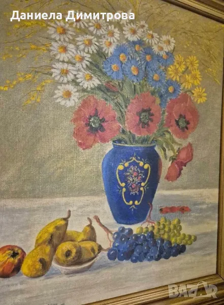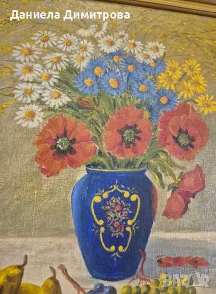 Внесете полъх на лятото във вашият дом. Насладете се на красотата на полските цветя, уловена в тази изящна картина. Наситените макове, нежните маргаритки и слънчевите жълти цветя , аранжирани в елегантна синя ваза създават усещане за свежест и хармония. Композицията е допълнена от сочни плодове, разположени върху светла драперия