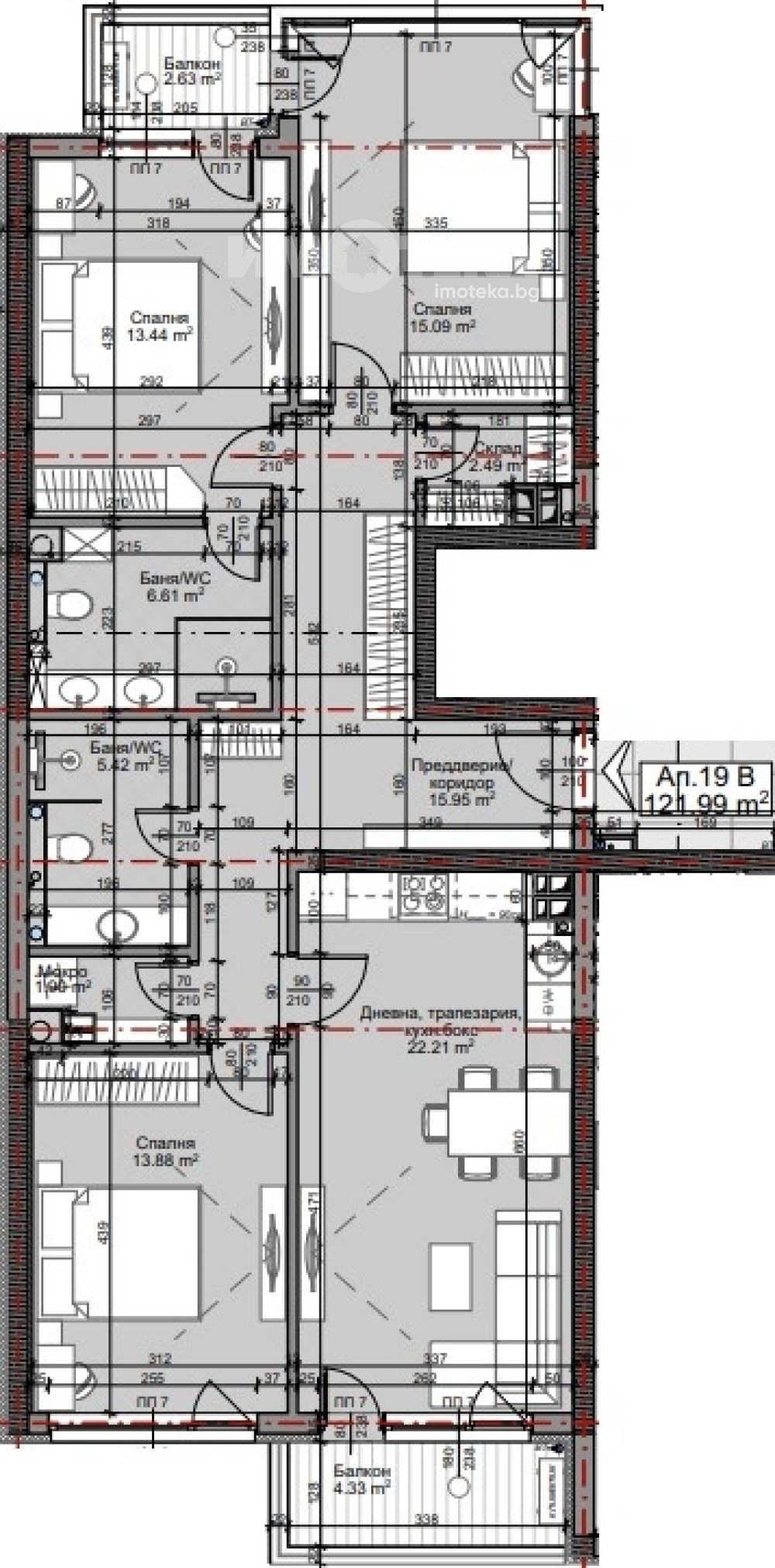 Функционален четиристаен апартамент, ВЕЧЕ С АКТ 14. Разположен е на пети етаж. Състои се от: хол с трапезария и кухненски бокс с площ 22.21 кв.м., три спални от 13.88 кв.м., 15.09 кв.м. и 13.44 кв.м., две санитарни помещения, два балкона, мокро помещение и склад. Изложенията са запад и изток. Има възможност за покупка на гараж или паркомясто.