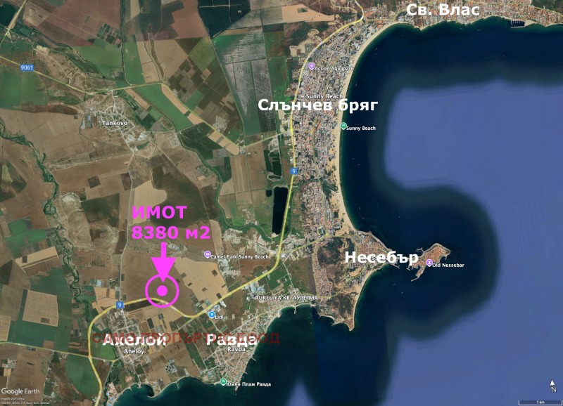 Продава се имот с площ 8380 кв.м.. Имотът административно се намира в землището на с. Равда до гр. Ахелой в местността ДЖУБЕРА. В непосредствена близост до главния и основен път Бургас Варна и който път представлява връзката м/у Бургас, Несебър, к.к. Слънчев бряг и Св. Влас. Имотът е подходящ, както за жилищно строителство, така и търговско или индустриялно строителство. Имотът е с правилна форма. Подходящ е и за малък комплекс от къщи, по-голямо имение, вила или за склад, шоурум, представителсто, автосервиз или фабрика без вредни емисии и др. Намира се на около 150 метра от главния асфалтов път. Сравнително близо е до съществуващото развитие. Освен за собствено ползване този имот е много подходящ и за инвестиционни цели поради стратигическото му местоположение в района и развитето му в близко бъдеще. Запознати сме с цялата история от придобиването на собствеността на имота, управлението през годините и сегашния му статут и ситуация. Агенцията ни се намира в пряк контакт със собственика на имота и бихме могли да договорим добри и гъвкави условия за сделка.