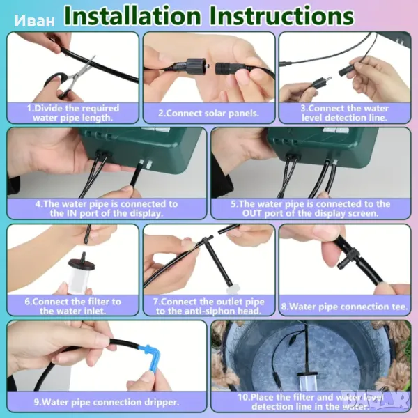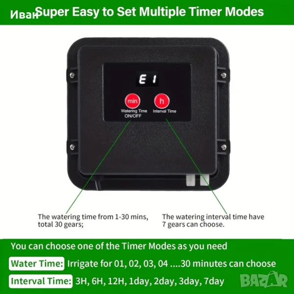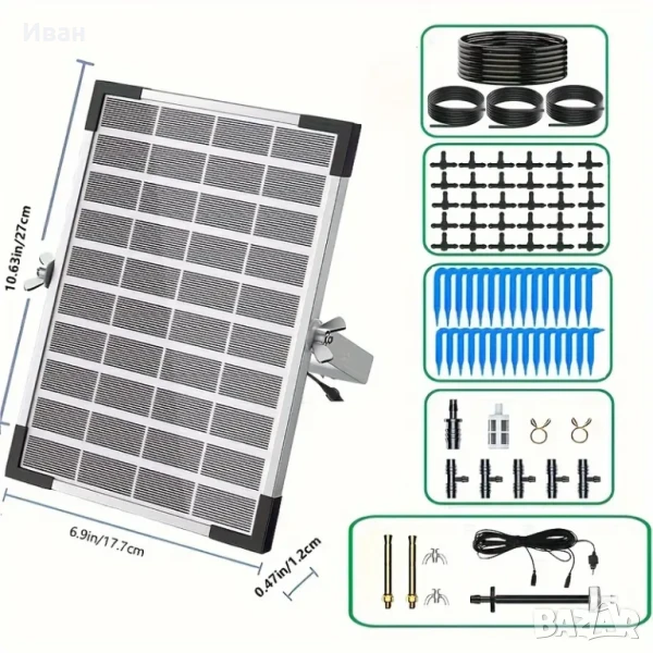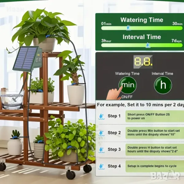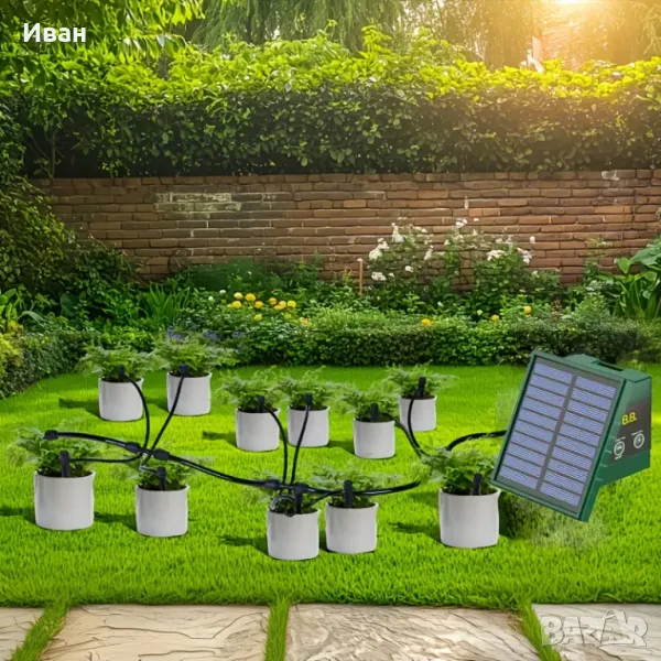 Захранва от слънчева енергия и може да тегли вода директно от контейнери като кофи, без да е необходим кран. Той може автоматично да напоява вашите растения на предварително зададени интервали от време и количества и автоматично издава аларма, когато водната помпа не е активна или има липса на вода в резервоара. Идеално устройство за балкони, вътрешни дворове, малки градини без кран и стационарно захранване.