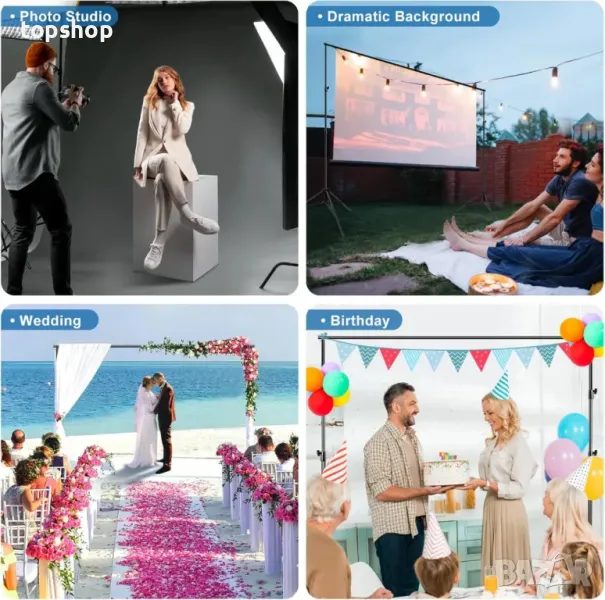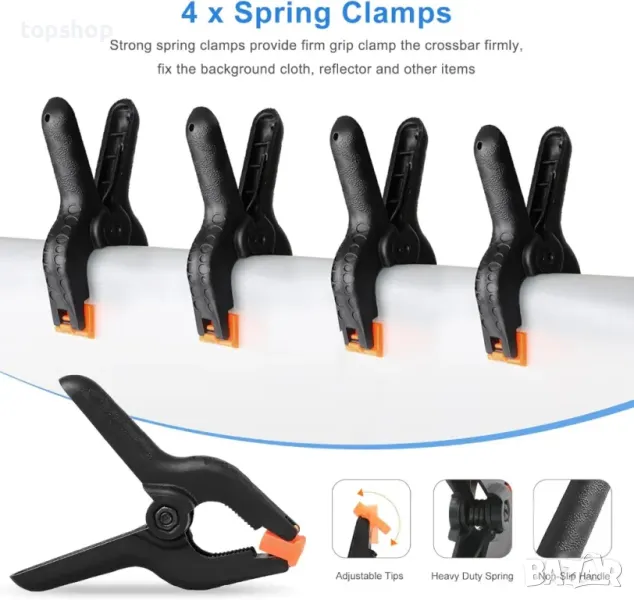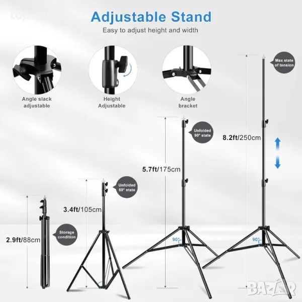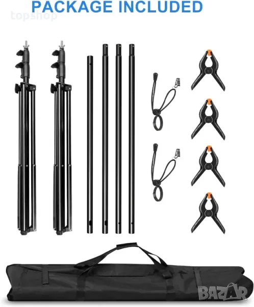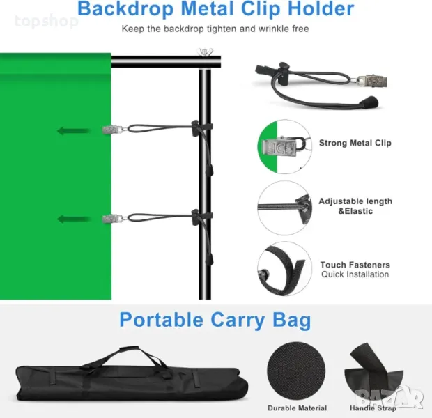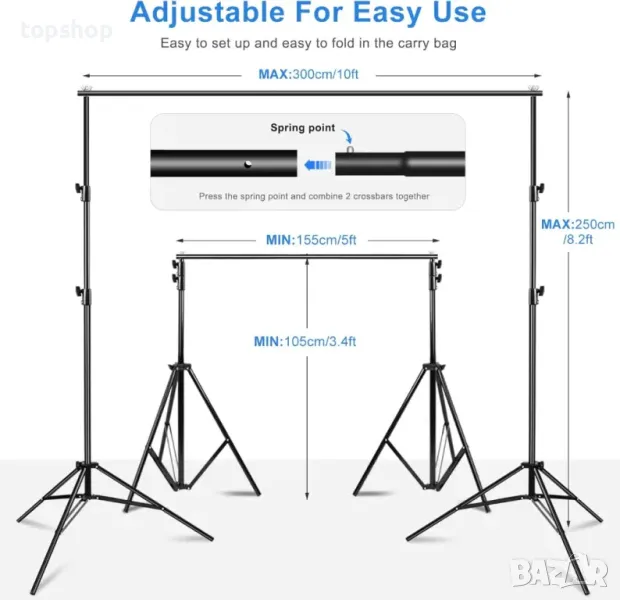 стойка за фон включва здрава рамка от алуминиева сплав с удебелен диаметър на тръбата и черно сатенено покритие за намаляване на отражението на светлината. Неговата регулируема височина (105-250 см) и ширина (155-300 см) го правят универсален за различни настройки. Комплектът включва здрави скоби и скоби, за да поддържат фоновете сигурни и плоски за по-добри резултати при снимане. Лек и преносим с компактна чанта за носене, той е лесен за съхранение и транспортиране. Идеален за фотография, видеоклипове, стрийминг на живо и декорация на събития, комплектът включва 4 напречни греди, 2 стойки за осветление, 4 пружинни скоби, 2 щипки и чанта за носене.