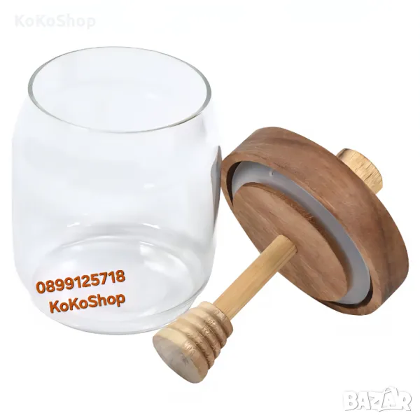 буркан за мед, стъклен буркан, буркан с дървена лъжичка, буркан HONEY, кухненски аксесоар, съд за мед, керамика и дърво, буркан 450 мл, декорация за кухня, пчелен мед