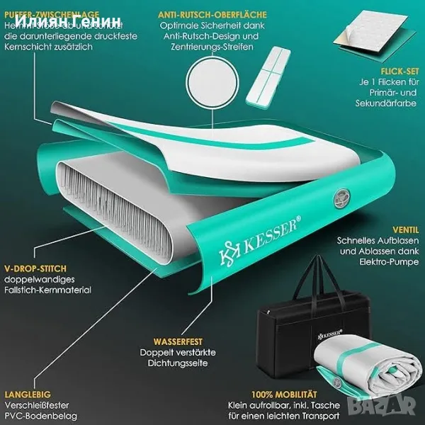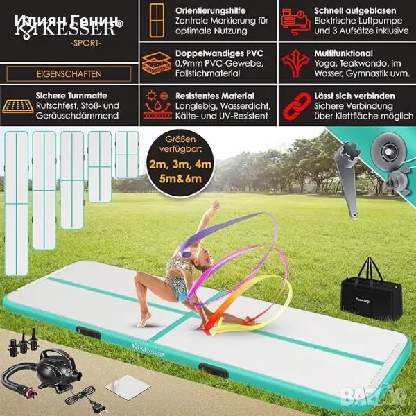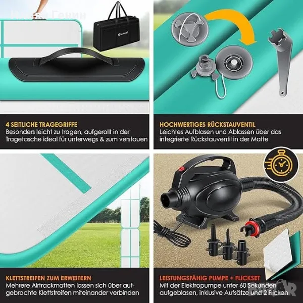 Постелката за гимнастика KESSER има специални брезентови PVC слоеве. Благодарение на технологията V-DROP-STITCH постелката за йога е особено издръжлива и издръжлива. Здравата подложка е изработена от PVC плат и запазва формата и стабилността си при натиск и удар.ЛЕСЕН ЗА ПРЕНАСЯНЕ: Практичните дръжки за носене гарантират, че постелката за гимнастика може да се мести бързо и лесно. Когато е сгъната, тренировъчната постелка може лесно да се съхранява и транспортира с включената чанта. Air track mat е идеален тренировъчен комплект за деца и възрастни. Независимо дали на плажа, в градината на тревата или във водата - тренировъчната постелка може да се използва почти навсякъде. В тренировъчния център, във фитнес клубове, в клубове по танци, в училища, във фитнес зали, в парка, в развлекателни центрове, по време на къмпинг, в офиси или у дома. Електрически надуваемата подова постелка от KESSER предлага много възможни приложения както за млади, така и за възрастни. Електрическата въздушна помпа, която е включена в доставката, помага за бързото надуване и издухване на гимнастическия надуваем дюшек. В напомпано състояние въздушната подова релса издържа няколко дни. Разширяем и гъвкав въздушен маркуч, три различни приставки, материал за закърпване и практични инструменти – всичко това отличава помпата и гарантира, че сте готова за употреба в рамките на минута!ПОДХОДЯЩА ЗА ВСЯКАКВИ ВЪЗРАСТИ: Спортна постелка за всички възрасти и много дейности (упражнения на пода, есенни тренировки, йога, високопроизводителни спортове, акробатика, гимнастика, фитнес, пилатес, кикбокс, плуване), която не издава смущаващи шумове по време на тренировка. В допълнение към многото дейности, можете също да намерите спокойствие и релакс на тази постелка. С подходящи упражнения стресът може да бъде намален и проблеми като болки в гърба могат да бъдат предотвратени или дори елиминирани.ПРОДУКТОВИ АКЦЕНТИВелкро закопчалка за бързо свързване на допълнителни елементиЦентрирани маркировки за идеална ориентацияобратен клапанЛесен за съхранение и транспортиранеБърз монтаж и демонтажЗдрав, ударо и шумоизолиращУдобни и устойчиви на UV лъчиПротивоплъзгаща се повърхностИзисква малко място за съхранениеПродължава няколко дни след инфлациятаЛесно почистванеВодоотблъскваща и устойчива на потТехнически данниМатериал: PVC платДвустенна, дебелина 0,9 ммМатериал с капков бодВодоустойчивturnmatte 400cm k-tm4