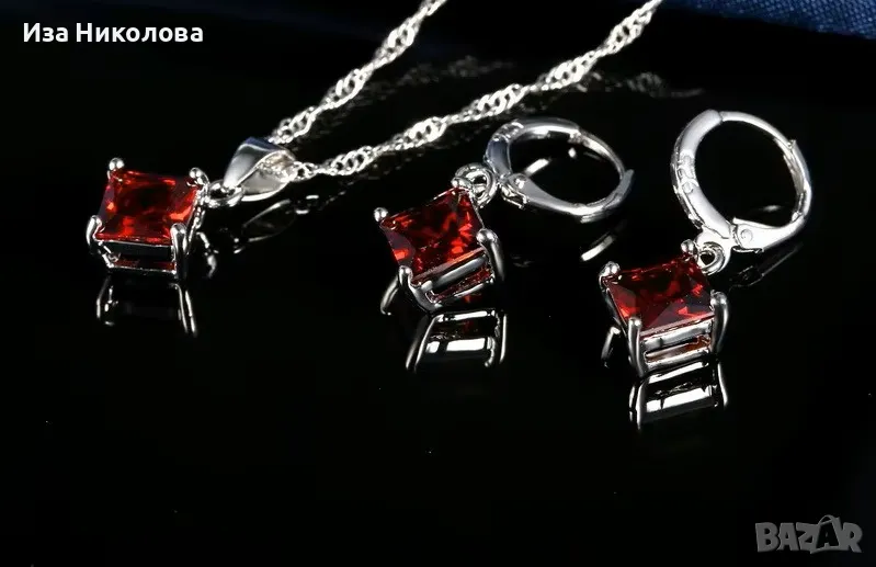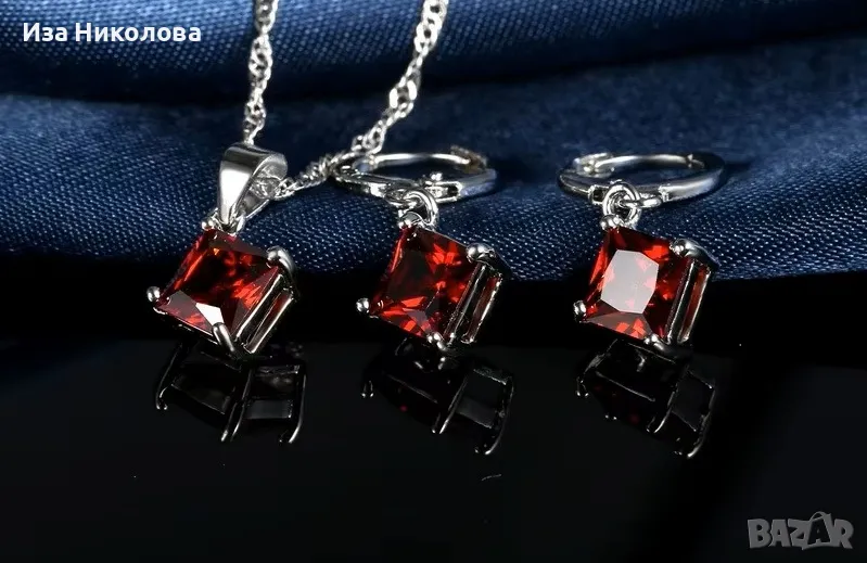 Сребърни комплекти обици и колие със сапфири налични в червен, зелен, бял, лилав, розов и син цвят.
