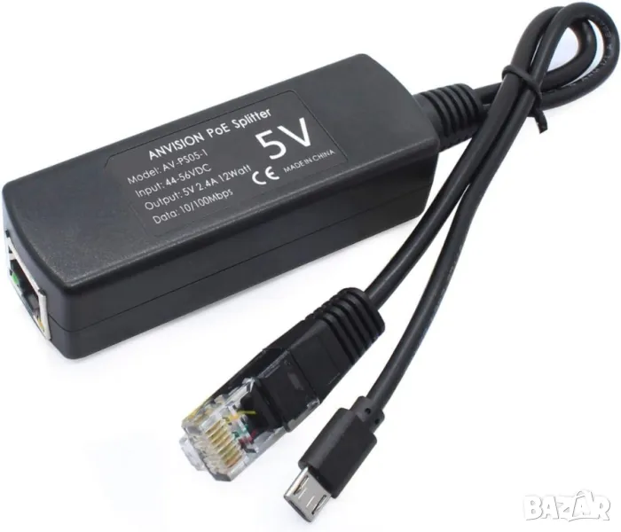 ANVISION AV-PS05-1 - 5V PoE сплитер, 48V към 5V 2,4A адаптер с Micro USB щепсел, съвместим с IEEE 802.3af, за IP камера, таблети, Dropcam или