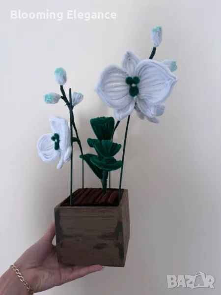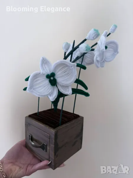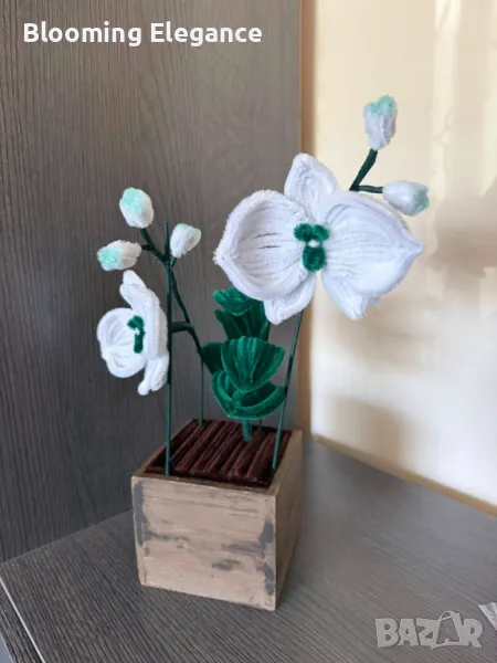 Ръчно изработената орхидея от плюшена тел и текстил съчетава елегантност, стил и топлина. Всяко листенце и венчелистче е оформено с грижа, за да създаде изящество, което не увяхва – перфектният акцент за дома или специален подарък за любим човек.