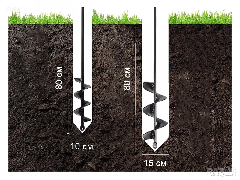 - Ръчно свредло за пробиване на пръст с обща дължина 100 см, с дълбочина на пробиване 80 см и диаметър на пробиване 10 или 15 см.