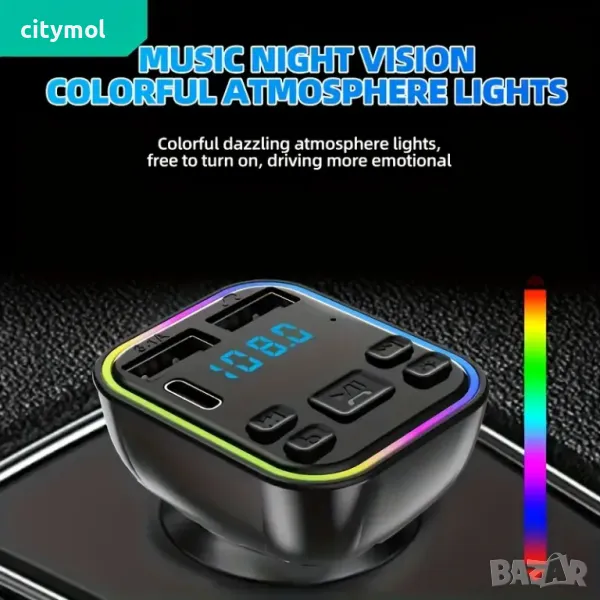 Висококачествен FM трансмитер за автомобил. Поддържа MP3 и WMA формат. Възпроизвеждане на музика от флашка и Блутут. Зареждане на външни устройства чрез 2xUSB и Type C портове.