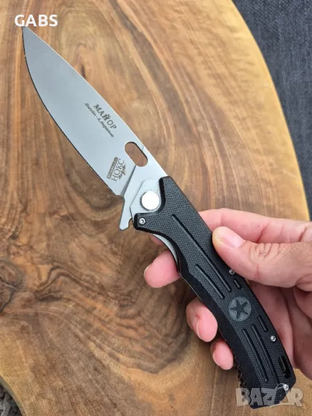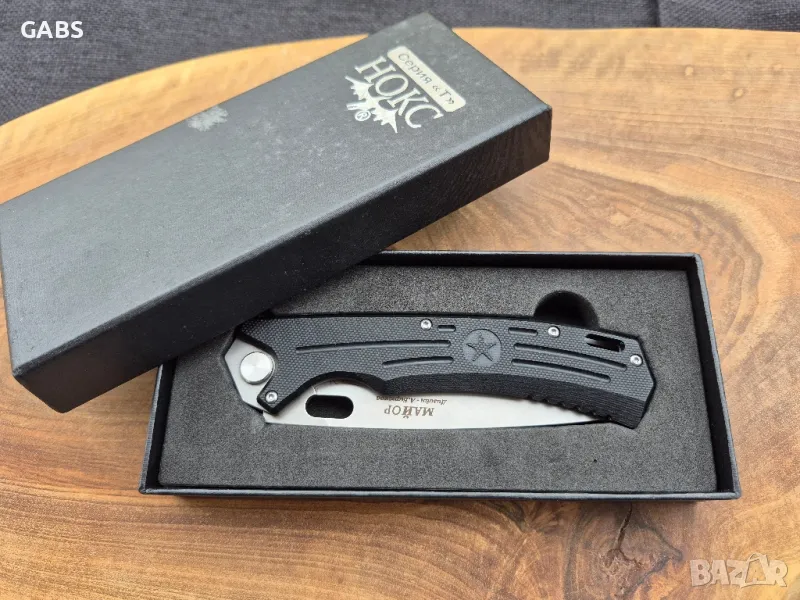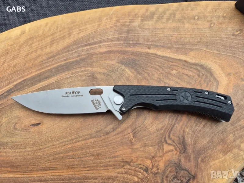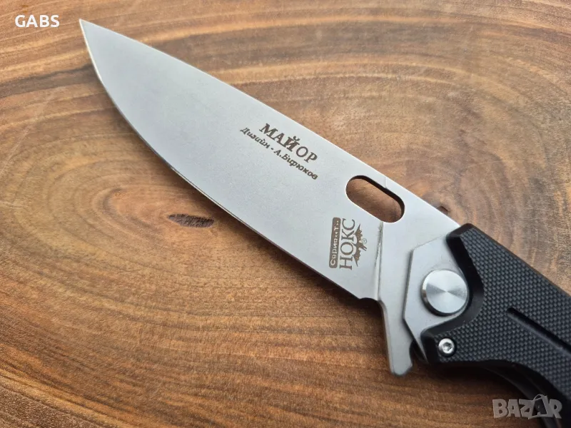 нож НОКС Майор,изработен с помоща на съвременна технология от последно поколение.Аксиалния модул на ножа съдържа лагер,осигуряващ много плавно и бързо отваряне.От обратната страна на лагера има бронзова шайба,която минимализира страничната луфтова част на ножа.Ножът се отваря интуитивно,светкавично бързо и се фиксира надеждно на ключалката Liner-lock.Изработен от висококачествена стомана D2,с висока твърдост от 59-61 HRC и красиво сатенено покритие.