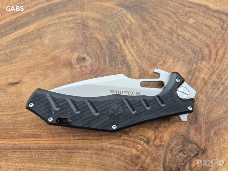 сгъваем нож НОКС Магнуст-2С,на дизайнера А.Бирюков впечатлява с необичайните си,нестандартни очертания.Дръжката е с анатомична оптимална форма с оребрени чирени,изработени от G10.Острието е изработено от висококачествена стомана D2,с висока твърдост от 59-61 HRC и с красиво сатенено покритие.Аксиалният модул на ножа съдържа лагер,осигуряващ много бързо и плавно отваряне.Ножът се отваря интуитивно ,светкавично бързо и се фиксира надеждно на ключалката Liner- lock.