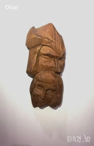 Дървена скулптура с изразителни, стилизирани човешки лица, изсечени от едно цяло масивно парче дърво. В долната част има монограм или знак , вероятно инициалите на автора на творбата. Това е модернистично изкуство вероятно от средата на 20-ти век.Размери 33 на 16 см. Чудесен интериорен акцент или декорация. Моля погледнете и останалите ни обяви!