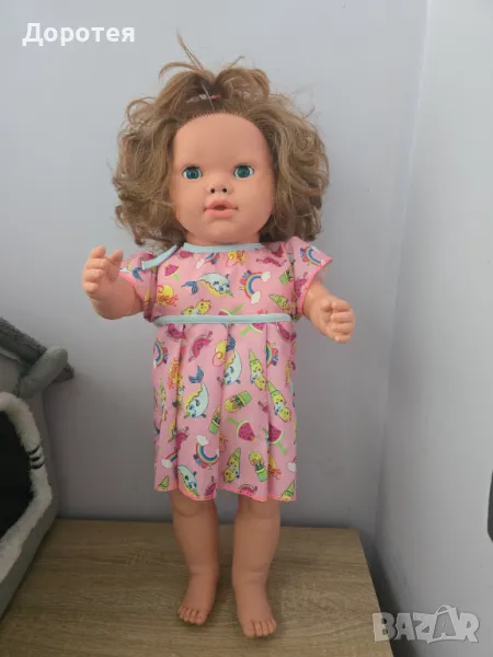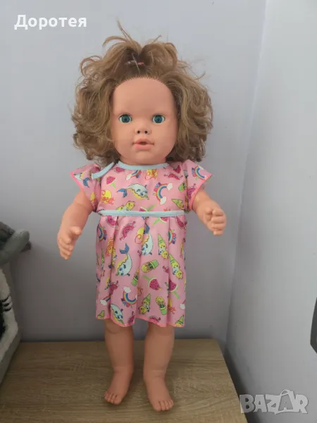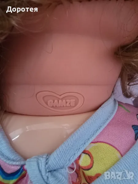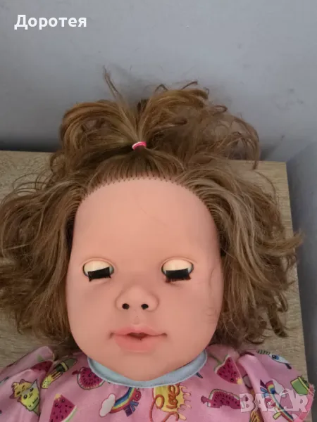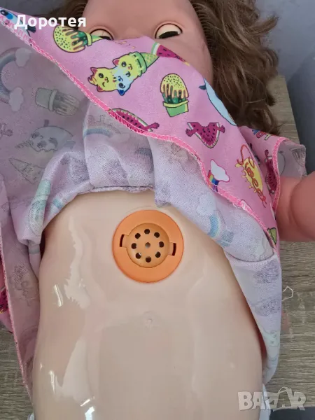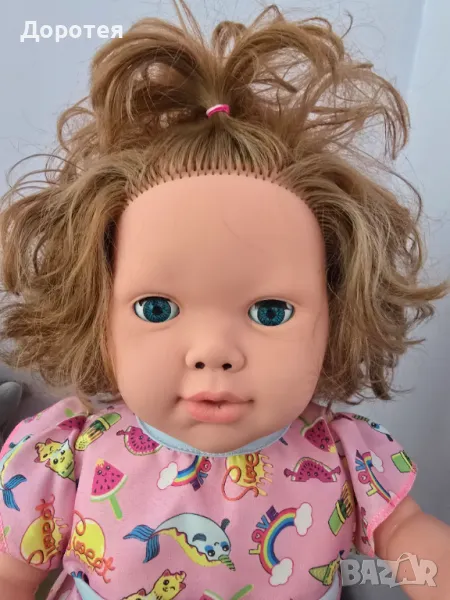 На тялото има копче което кара куклата да говори и да се смее.Говори на чужд език.Куклата е без забележки.