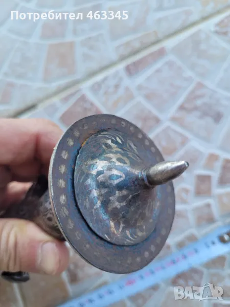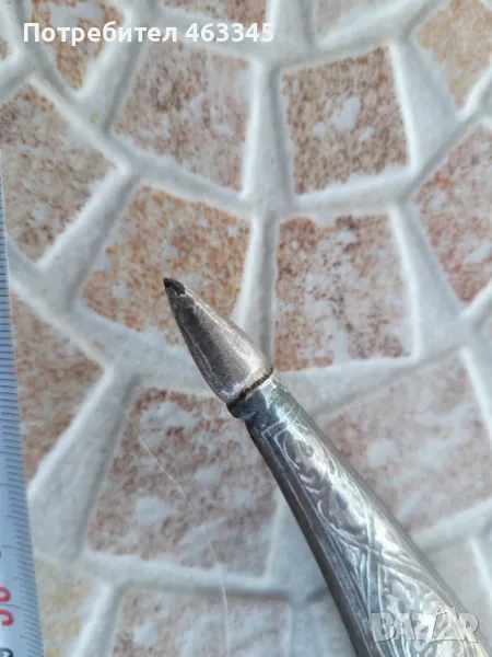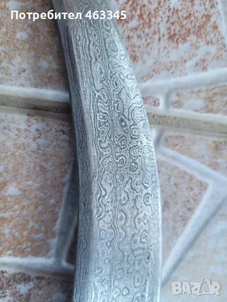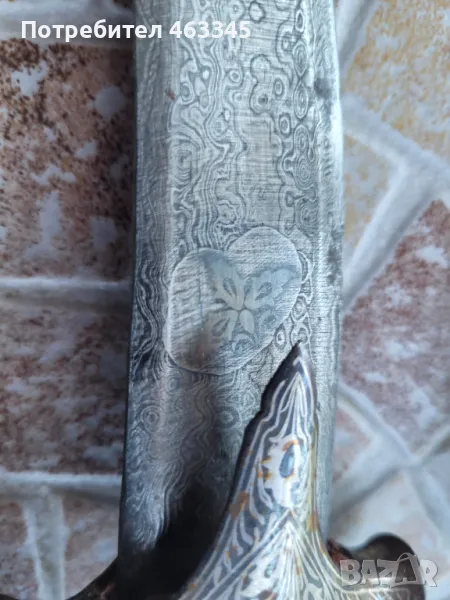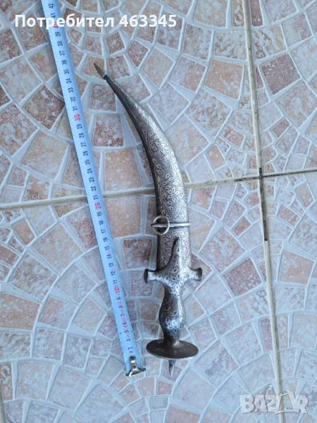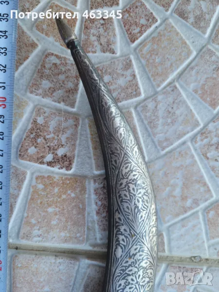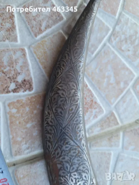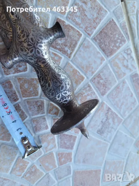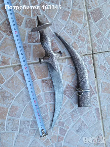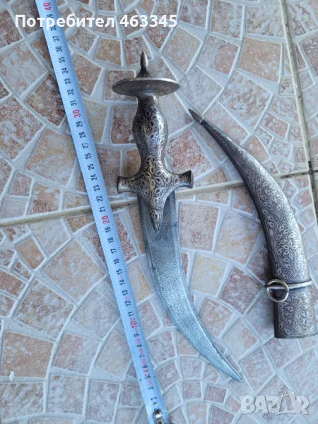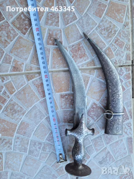 Изключителен сикски нож. Острието е изработено от дамаск а дръжката и ножната са украсени със сребърно кофтгари. И ефесът и ножната са изработени от желязо, което е сравнително чисто от ръжда, така че практически цялата украса си е налична. Изключителен образец
