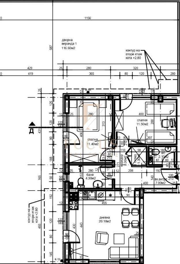 Апартаментът е с обща площ от 84,06 кв.м. със следното разпределение: антре, дневна с кухненски бокс, две спални, баня с тоалетна, склад и веранда - 116,60 кв.м.