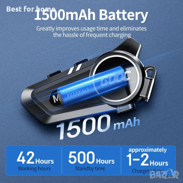 Капацитет на батерията 1500 mAh: слушалките за мотоциклетна каска съдържат акумулаторна полимерна батерия с капацитет 1500 mAh, която може да се използва непрекъснато в продължение на 180 часа след 2 часа зареждане. Значително подобрява времето за употреба, няма нужда да се притеснявате за зареждането по време на дълги пътувания на открито.