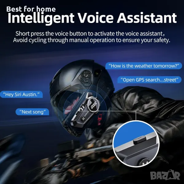 интерком за каска, мотоциклетни слушалки с гласов асистент, универсален високоговорител за каска, водоустойчива батерия 1500 mAh (колоездене/ски/катерене)