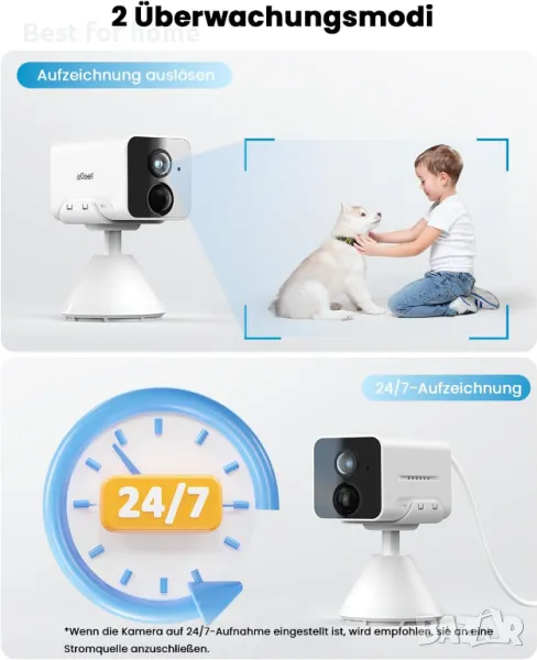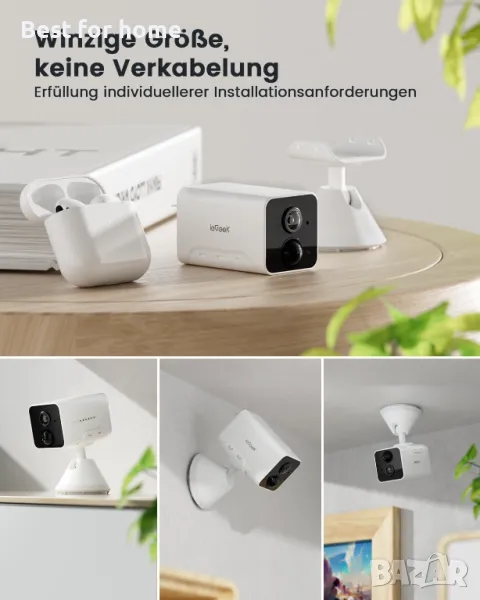 Компактна и лека батерия с презареждаща се батерия: (2 броя) Камерата за видеонаблюдение ieGeek е с компактни размери, предлага се с 2 x 3M лепила (за монтаж на камерата), не е необходимо пробиване на отвори, лесна за инсталиране. Сваля се за ръчна употреба. Батерията на вътрешната камера за видеонаблюдение може да се използва до 90 дни с напълно заредена батерия. Поддържа 7/24 часа запис, когато камерата е свързана с Type-C кабел.
