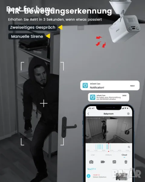 PIR сензор за движение и известяване за аларма: (2 броя). Безжичната вътрешна камера за наблюдение е оборудвана с PIR сензор за движение и монитор за бебета и домашни любимци. Откриването и чувствителността на хуманоиди могат да се регулират, за да се намалят фалшивите аларми. Освен това могат да се зададат периоди на алармата и зони за наблюдение. Когато бъде засечено движение, предупредително съобщение се изпраща на вашия телефон в реално време.