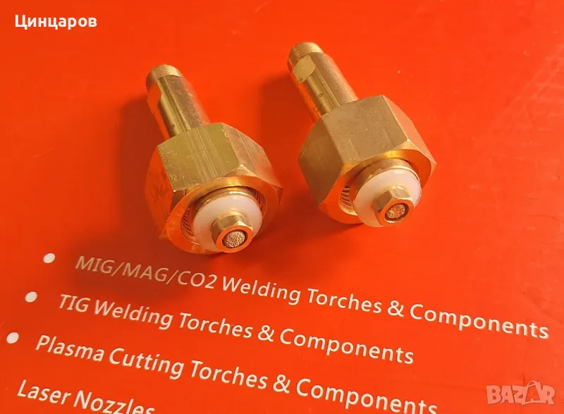 Комплект от 2бр.тела с челен пръстен тефлон уплътнител и филтър,гайки 2бр.съответенстандарт:Кислород,Со2,Азот,Пропан-бутан,Формир газ,Аргон,Коргон, Хелий водород