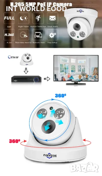 – Hiseeu HC615-P-3.6 5MP POE IP Camera е куполна IP камера с 5MP резолюция (1920P), която предлага ясно изображение и нощно виждане до 30 метра.