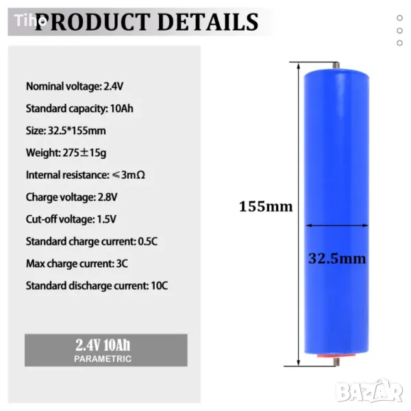 Максимално 2.85в. 15Ah , с заварени болтове М4 отстрани, с свързващи никелови планки . дължина 150мм, диаметър 42мм.