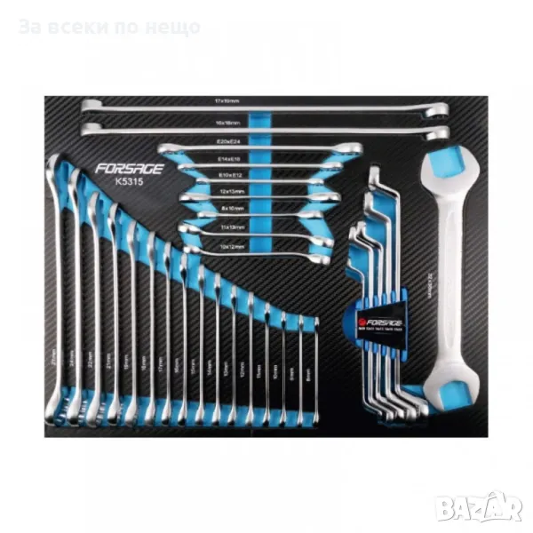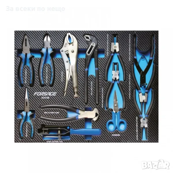 Количката за инструменти Forsage съдържа 274 елемента, има 5 рафта за инструменти, 2 празни рафта и допълнителна странична секция. Тялото е изработено от метал.