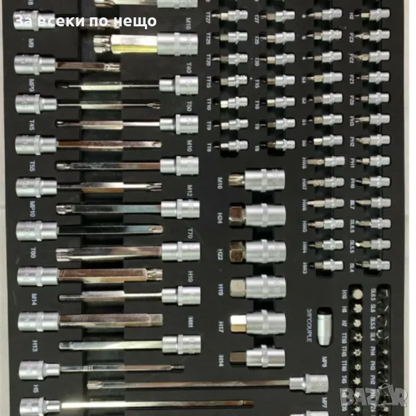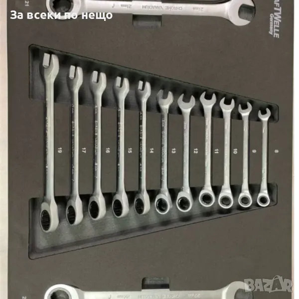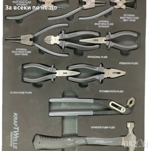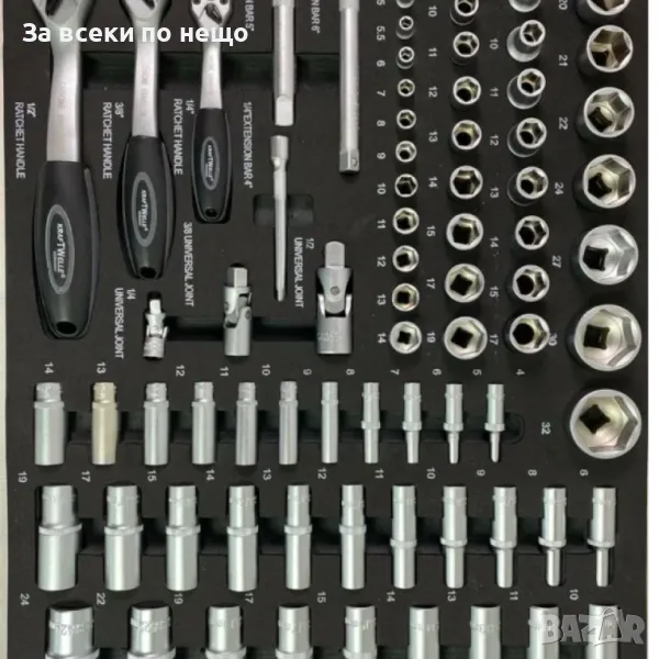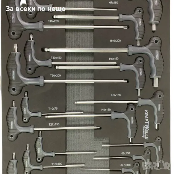 количка за инструменти със 7 чекмеджета, 6 от които са пълни с инструменти. Всички изтеглящи се чекмеджета са монтирани на сачмени лагери. Когато чекмеджетата са затворени, те се заключват и по този начин предотвратяват неволно отваряне при маневриране. Чекмеджетата или цялата количка могат да се заключват, включени са 2 ключа. Количката за работилница има 4 стабилни колелца, 2 управляеми, 1 заключващо се, които осигуряват много удобно търкаляне. На количката за инструменти има стабилен работен плот от неръждаема стомана. Инструментите, съдържащи се в количката за работилницата, са изработени от хром-ванадиева стомана и се съхраняват в вложки от стиропор/пяна.