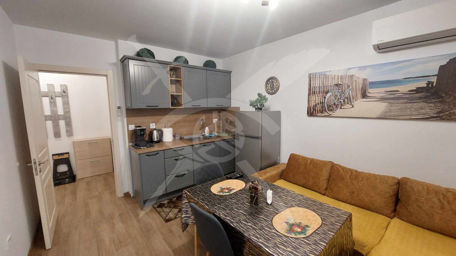 РАЗПРЕДЕЛЕНИЕ: Жилището разполага с площ от 58 кв.м., разпределена във входно антре, дневен тракт с кухненски бокс, спалня, тераса, баня и тоалетна.