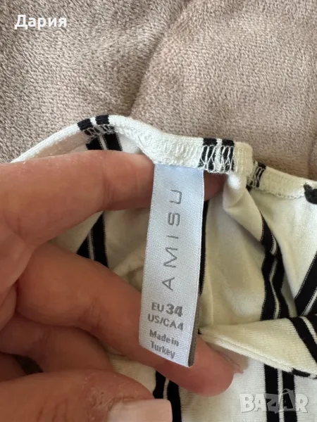 Подходящ както за ежедневието, така и за плаж или лятна вечеря. Елегантен дизайн с вертикални черни райета върху бяла основа.