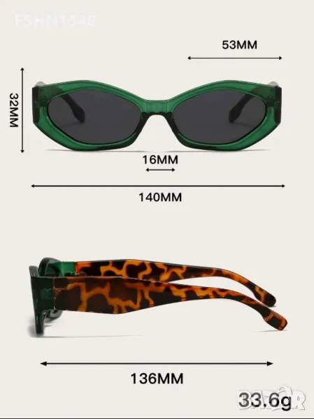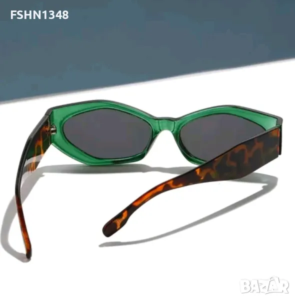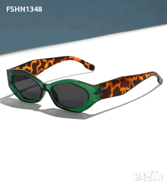 Слънчеви очила тип котешко око, зелена рамка, с леопардова кафява шарка на дръжките.