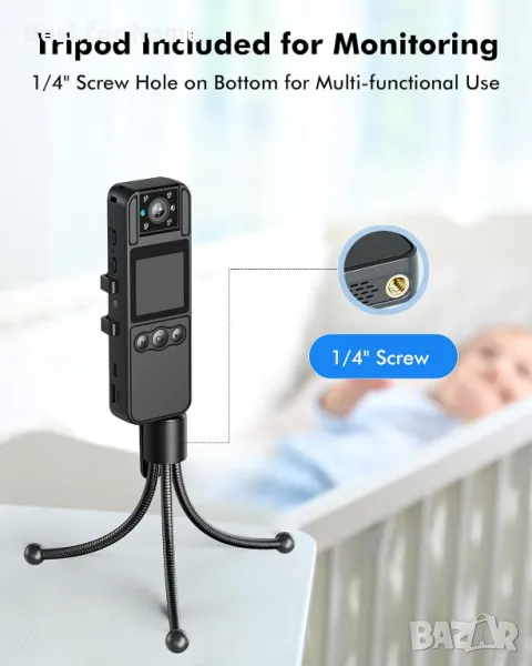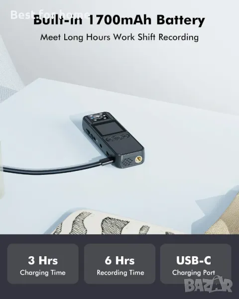 Вградена батерия от 1700 mAh за 6 часа видеозапис: Освободете силата на 6 часа непрекъснат видеозапис, осигурявайки достатъчно покритие за сервизни специалисти и куриери. Включеният статив осигурява стабилна работа със свободни ръце, което позволява гъвкаво използване в различни сценарии.