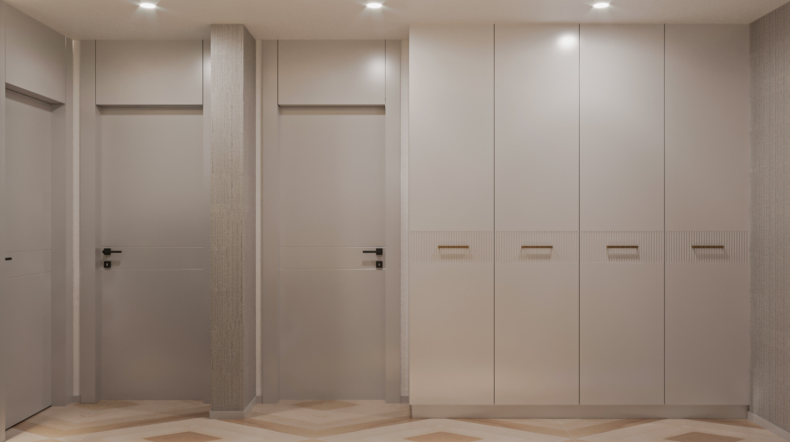 Коридорът е облицован с текстил, който придава мекота и уют на пространството. Текстилът е в светли тонове, които създават простор и светлина. Пода е от фигурален паркет, който образува интересни геометрични форми.Интериорните врати от МДФ с височина H-2,65m. създават усещане за простор. Коридорът е хармонично продължение на всекидневната.