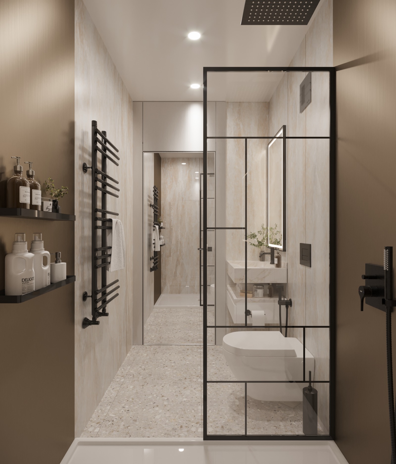 Баните са изработени от мрамор и драскан метал, които създават луксозна и модерна атмосфера. Оборудването на баните включва мивка, огледало, параван, душ корито, смесител и вградена структура. Мивката е вградена в шкаф с плот от мрамор, който осигурява пространство за съхранение. Огледалото е с вградено осветление. Параванът е от стъкло и метал, който разделя мократа зона от останалата част на банята. Дизайнът на баните е елегантен и функционален, като предлага комфорт и качество.